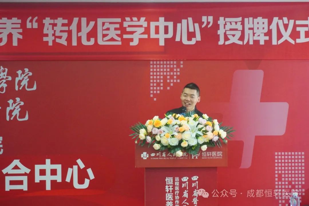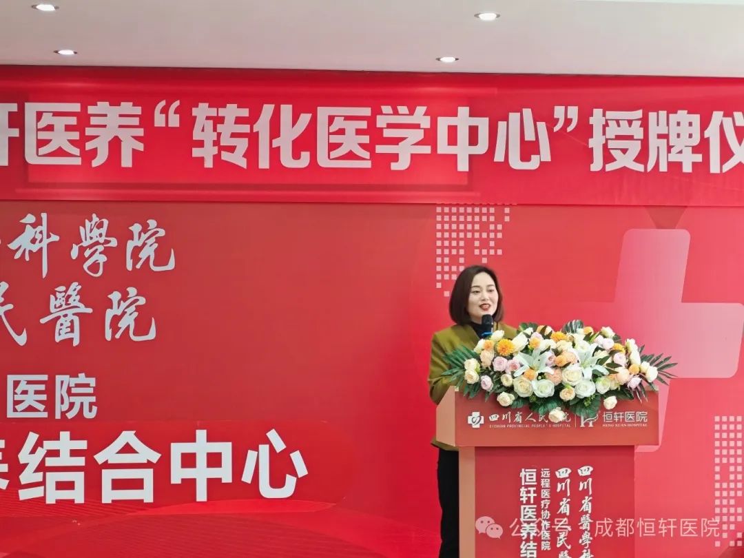 2024年3月19日下午,新生命·恒轩医养“转化医学中心”授牌仪式在我院举办。 新生命赛尔副总经理颜秉意、运营中心副主任申培、运营中心主任助理黄驰,恒轩医养董事长李强、院长何飞、副院长胡秋菊、副院长李丹红、特聘专家戎健出席授牌仪式。 领导致辞 授牌仪式由恒轩医养副院长胡秋菊主持。她对莅临现场的领导和嘉宾表示了热烈欢迎,新生命与恒轩建立转化医学中心,将推动恒轩医养事业的高质量发展。 恒轩医养副院长 胡秋菊 恒轩医养院长何飞发表了致辞,并阐述了“做生命的守护者”是恒轩的愿景,相信在新生命医疗技术的助力下,恒轩会在医疗健康、养老事业实现跨越式发展,与新生命同心同德携手共进为患者和长者的健康谋福祉。 恒轩医养院长 何飞 新生命赛尔副总经理颜秉意表示,新生命将与恒轩医养一起共同绘就新兴医疗技术发展新蓝图,促进再生医学技术的发展,为人类健康事业的发展和科技进步作出积极贡献。 新生命赛尔副总经理 颜秉意 授牌仪式 新生命与恒轩医养建立战略合作关系,正式成立新生命·恒轩医养“转化医学中心”。 院区参观 授牌仪式结束后,院长何飞带领新生命各位领导参观了医养中心医疗大厅、住院部、康复医学中心、康养居住区、医养居住区等场所。 新生命的各位领导对恒轩的企业文化和服务理念给予了高度评价,随后双方进一步对服务模式进行了深入交流,切实为患者和长者提供更优质的健康管理服务。 新生命·恒轩医养“转化医学中心”正式成立,使我们又有了一层新的身份,这层身份将让我们跨上一个新的台阶,是责任更是担当。 未来恒轩将充分利用新生命高精尖的医疗技术与健康管理平台,实现医疗技术、生命质量管理的跨越式发展,守护患者和长者的生命与健康。